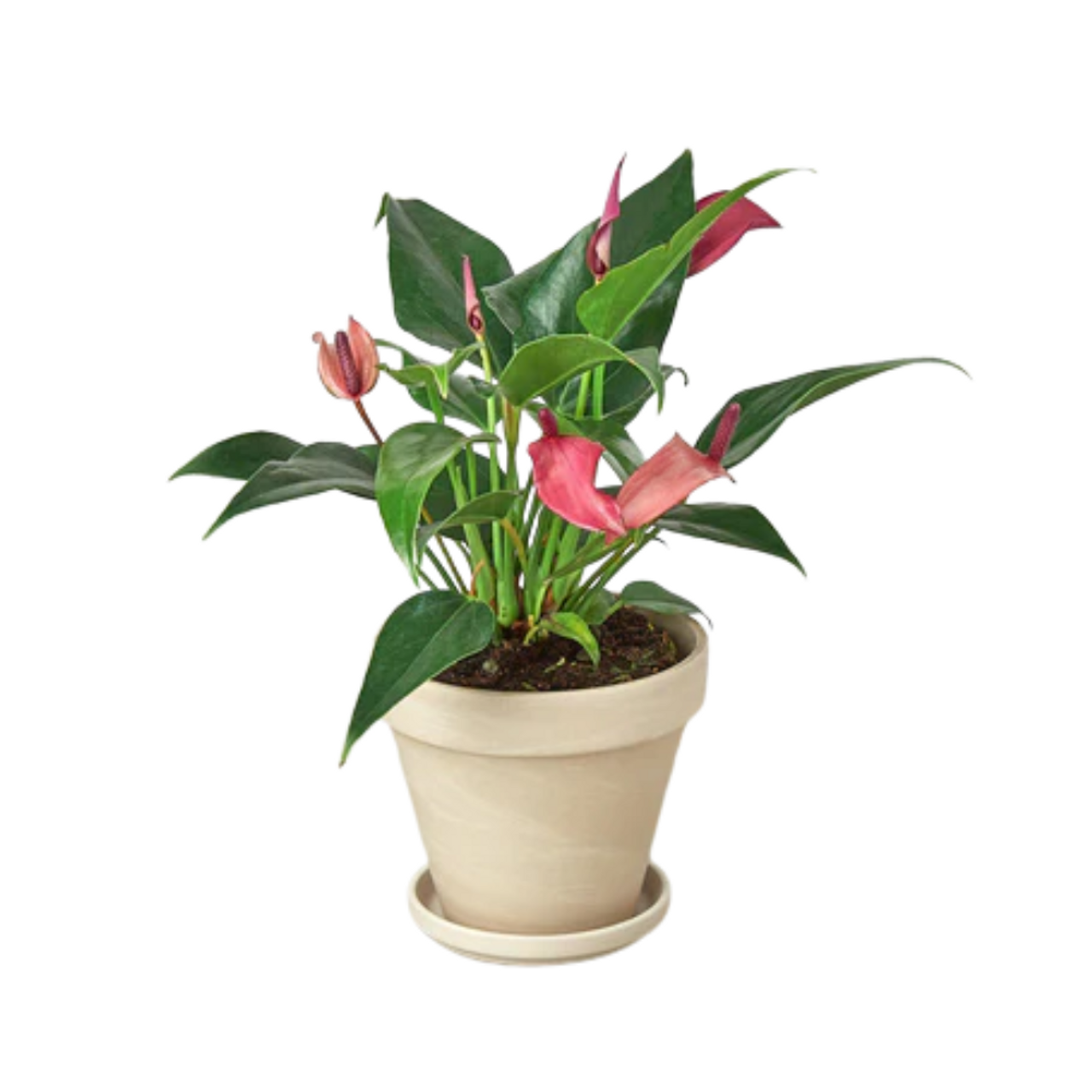 Prune off damaged or dying leaves as they appear and snip off spent flowers. Repot the purple anthurium every two to three years into a slightly larger pot. Use a well-drained, fertile potting soil with ample organic matter.