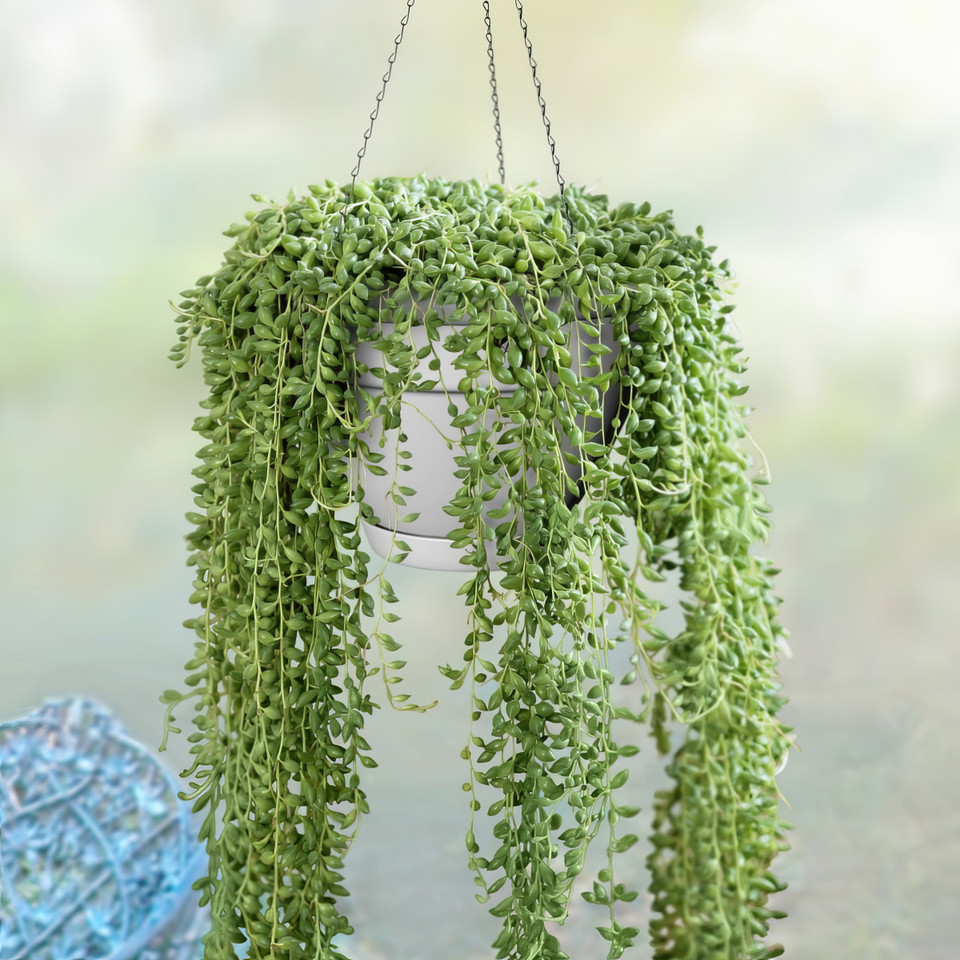 String of Pearls is an interesting hanging succulent that grows as a ground cover in its native region in Africa. The juicy round leaves resemble pearls growing on a string and are exceptionally easy to propagate. This plant looks best when it is grown in a hanging pot where the long stems can be left to drape and grow downward.