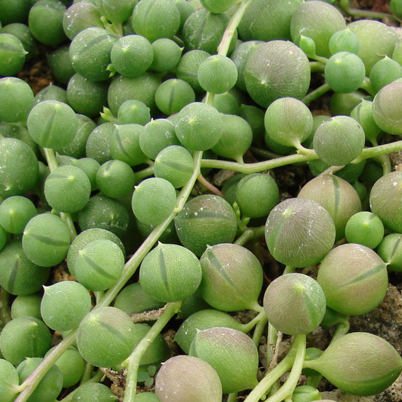 Succulents are very drought tolerant and can go for weeks in between waterings. Let the soil dry out, so that the roots have adequate air circulation. Watering once every 7-10 days during active growth in the summer is typical. Water until the liquid just starts to come out of the drainage holes. String of Pearls slows growth in the winter and can go 2-3 weeks between watering, depending on the room’s humidity level. A quick spritz of water every 2-3 days will provide higher humidity levels without causing the fleshy leaves to rot.