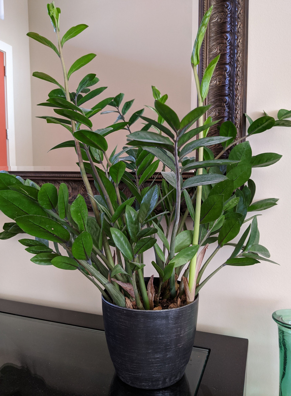 Plant ZZ Plant in any well-drained potting soil. The ZZ Plant is a slow grower; it will only need to be repotted every 2-3 years. This plant is not picky about pot size. Ideally, you want to upgrade the pot size by one to two inches when repotting. Remove yellow leaves as needed. Prune stems above soil level as desired. Never expose the plant to temperatures below 40 degrees F.